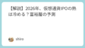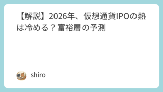 仮想通貨 【解説】2026年、仮想通貨IPOの熱は冷める?富裕層の予測 【編集長Shiro】仮想通貨業界の富裕層やリーダーが、2026年には仮想通貨企業のIPO(新規株式公開)熱が冷めると予測。その背景と日本市場への影響を深掘りします。 2026.02.05 仮想通貨