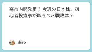 資産運用 高市内閣発足? 今週の日本株、初心者投資家が取るべき戦略は? 第2次高市内閣発足に向けた報道に、初心者投資家は「今すぐ買うべきか?」と迷うかもしれません。しかし、焦りは禁物です!具体的な政策発表を待ち、RSIやPERといった数値基準で市場の過熱感を冷静に見極める戦略を解説します。 2026.02.16 資産運用