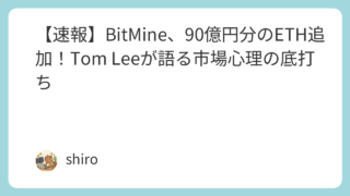 仮想通貨 【速報】BitMine、90億円分のETH追加!Tom Leeが語る市場心理の底打ち BitMineが90億円相当のETHを追加取得。Tom Leeは現在の市場感情が2018年、2022年の底打ち局面と酷似すると指摘。この動きが日本の個人投資家に与える示唆を深掘りします。 2026.02.19 仮想通貨