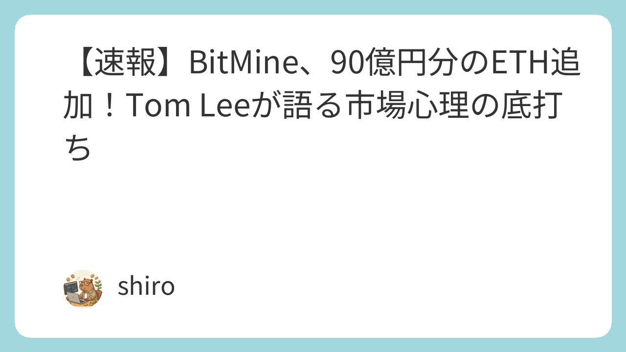 - 大手マイニング企業BitMineが、元記事によると、9000万ドル(約135億円、1ドル150円換算)相当のイーサリアム(ETH)を追加取得しました。